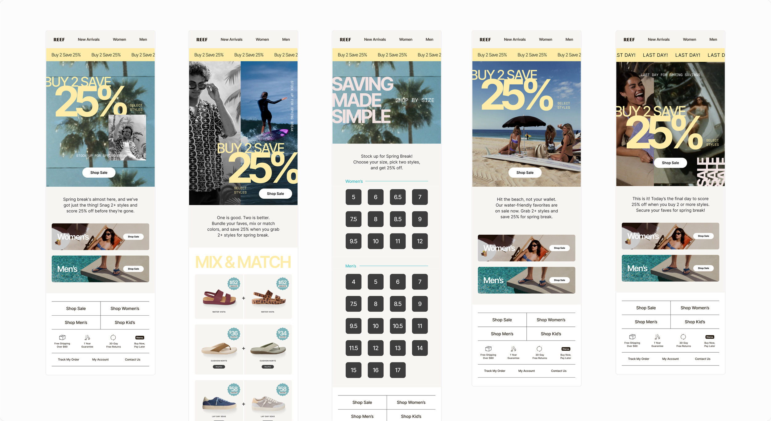 Digital campaign for REEF’s major seasonal sale, delivering a high-impact digital experience across the homepage, landing page, paid media, and email. The goal was to create an immersive, beach-inspired shopping environment that balanced urgency with brand storytelling. I spearheaded a fun, modular design system with bold typography, product-forward visuals, and motion elements that highlighted key offers while keeping the brand’s laid-back surf vibe intact. The campaign drove strong engagement and exceeded conversion benchmarks, reinforcing REEF’s identity while driving results.